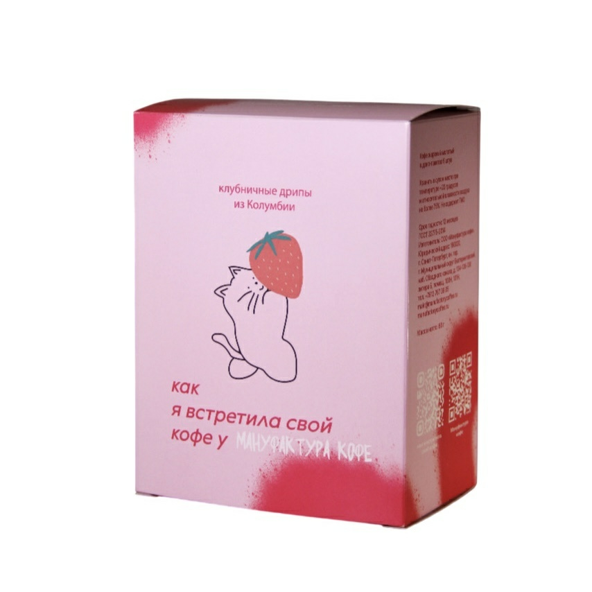 На упаковке котик своровал из корзинки клубничку, чтобы добавить её в Колумбию Ла Каскада Мастефи, поэтому как только открывается дрип всё вокруг наполняется ярким ягодно-тропическим ароматом.